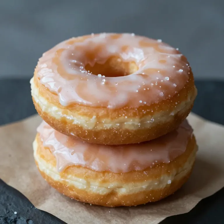 A close-up of two glossy, peach-colored glazed donut rings stacked on parchment paper, illuminated by soft, diffused light that highlights their texture and creates a warm ambiance. The shallow depth of field and neutral background ensure the donuts are the focal point.