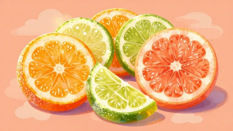 A vibrant arrangement of sliced citrus fruits, showcasing glossy, translucent textures with visible seeds and pulp, illuminated by diffused, soft light from above, creating highlights and shadows. The warm peach background with subtle cloud-like shapes adds a dreamy, airy feel, providing ample copy space for design elements.