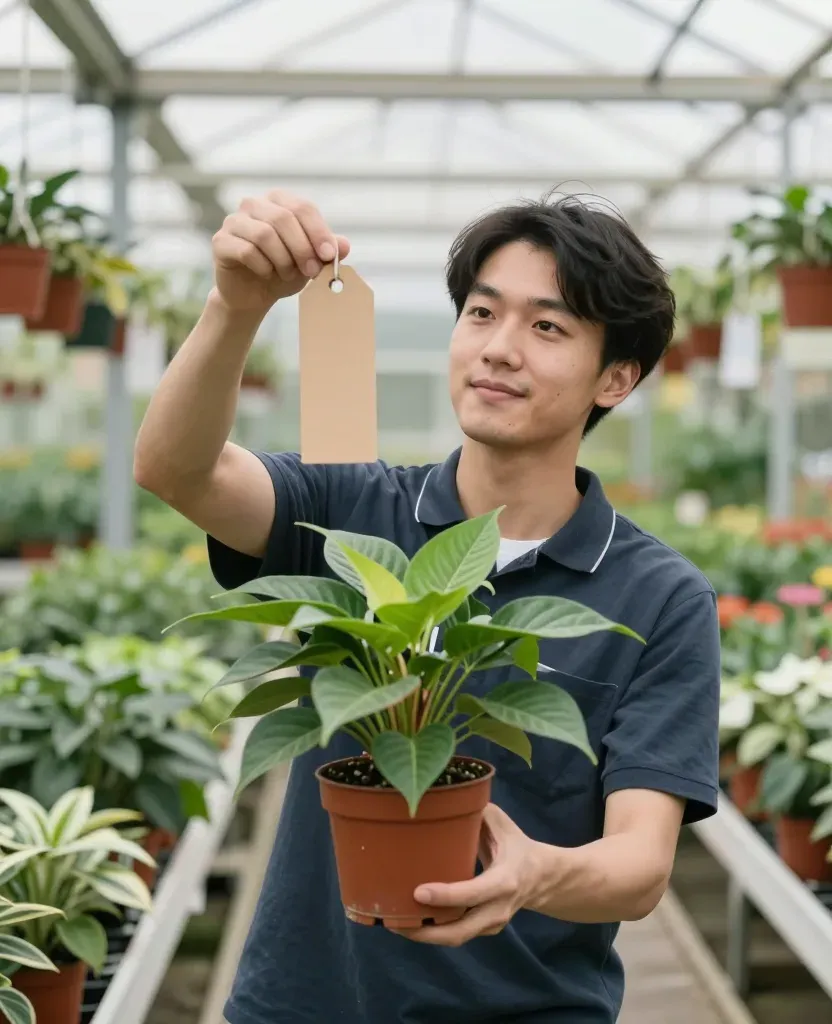 A young man holds a potted plant and a price tag, showcasing the plant's glossy leaves and soft soil under diffused natural light. The slightly blurred background of the greenhouse setting with various plants and hanging pots adds depth and context to the image.