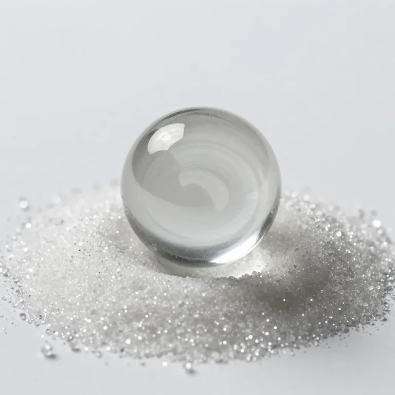 A glass marble with a smooth, glossy surface sits atop a bed of fine, glistening sugar grains, illuminated by soft, diffused light that highlights the marble's reflective surface and the sugar's shimmering texture. The shallow depth of field blurs the background, emphasizing the marble and sugar as the main subjects.