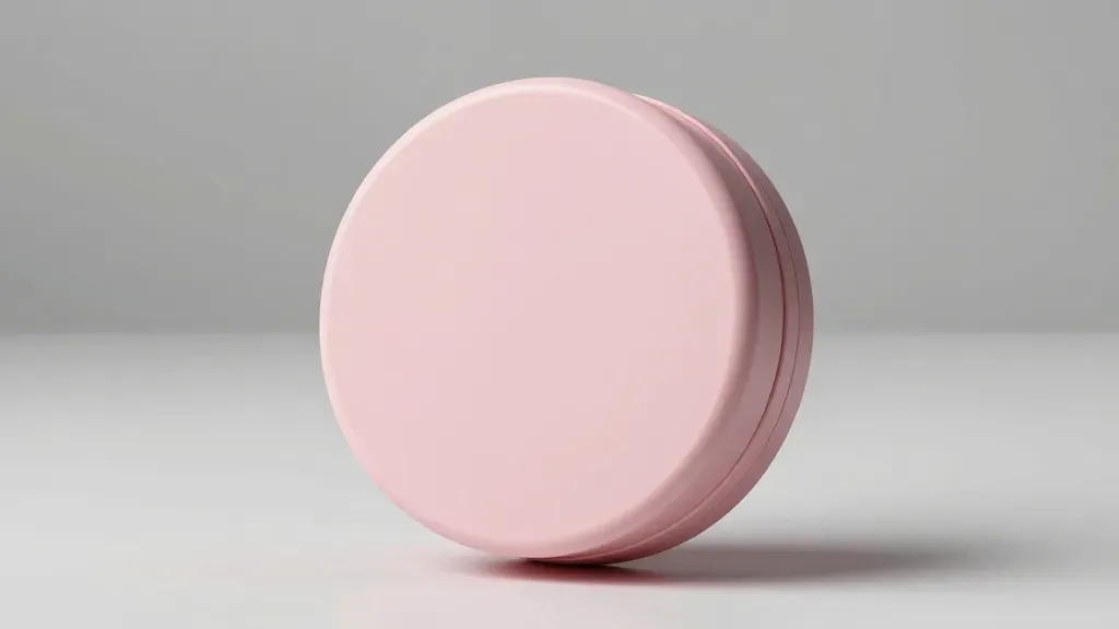 A glossy, smooth, pastel pink compact case is slightly tilted, showcasing its elegant design under soft, diffused lighting that creates gentle highlights and subtle shadows. The clean white background and minimalist composition emphasize the subject, providing ample copy space for branding or text.