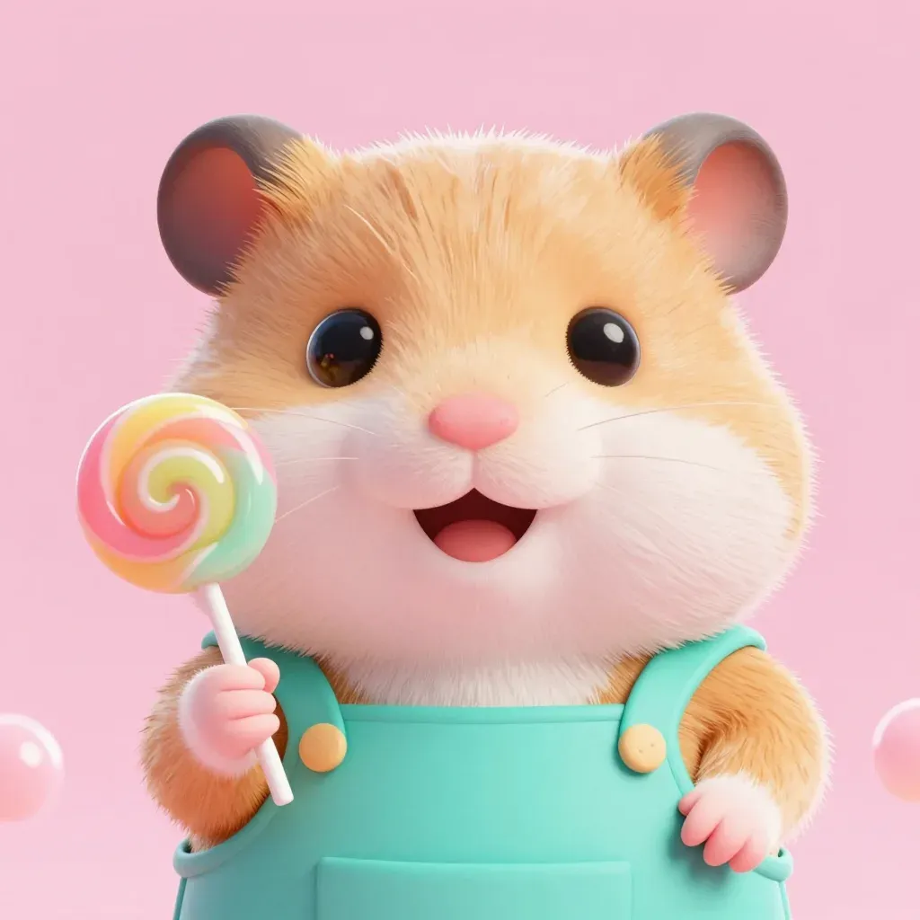 A fluffy golden-brown hamster in mint green overalls holds a glossy rainbow lollipop, its soft fur and rounded pink nose illuminated by warm, diffused front lighting. The centered, eye-level composition with shallow depth of field and floating bubbles creates a playful, dreamlike atmosphere against a solid pastel pink background.