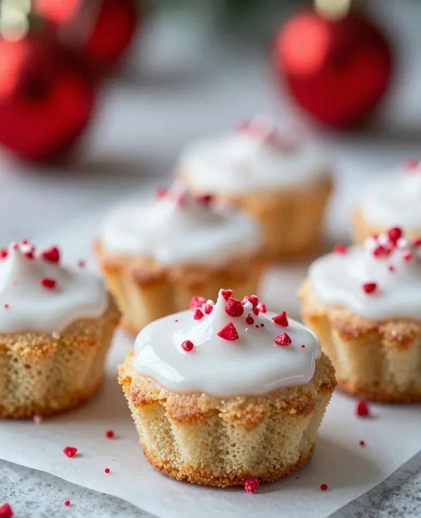 Soft, crumbly cupcakes topped with glossy white peppermint glaze and red sprinkles, arranged in a staggered formation against a festive background of blurred red ornaments. The soft, diffused lighting highlights the texture and color of the glaze and sprinkles, creating a clean and inviting composition.