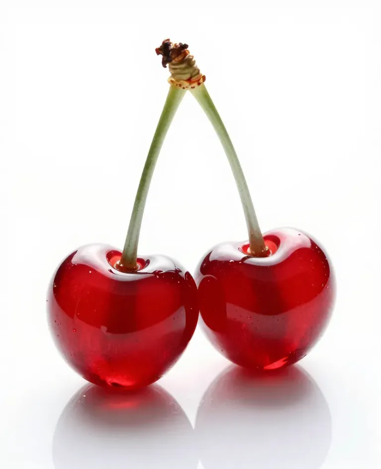 Two glossy, translucent cherries side-by-side, highlighted by soft, diffused light that accentuates their vibrant red hue and glossy texture. The clean, minimalistic white background provides a stark contrast, emphasizing the cherries' vibrant color and glossy finish.