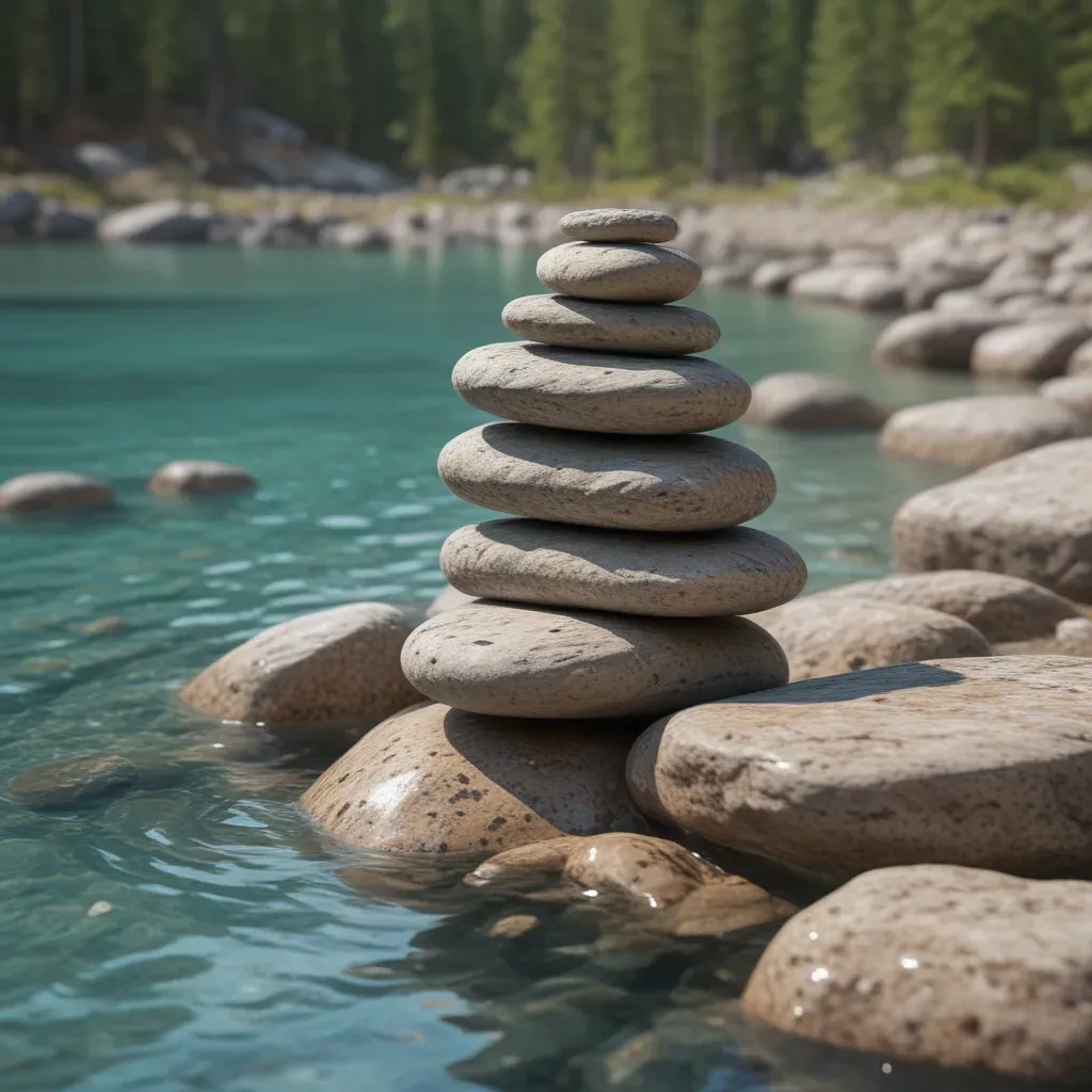 A serene stack of smooth, rounded stones balanced on a clear, turquoise alpine stream, with a blurred forest and rocks in the background, creating a sense of depth and tranquility. The soft, diffused lighting highlights the textures of the stones and the water, emphasizing the natural beauty and calmness of the scene.