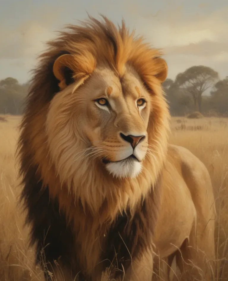 A majestic lion with golden fur stands in a savanna, bathed in warm, golden sunlight. The shallow depth of field isolates the lion, emphasizing its regal presence against the blurred background of trees and soft horizon.