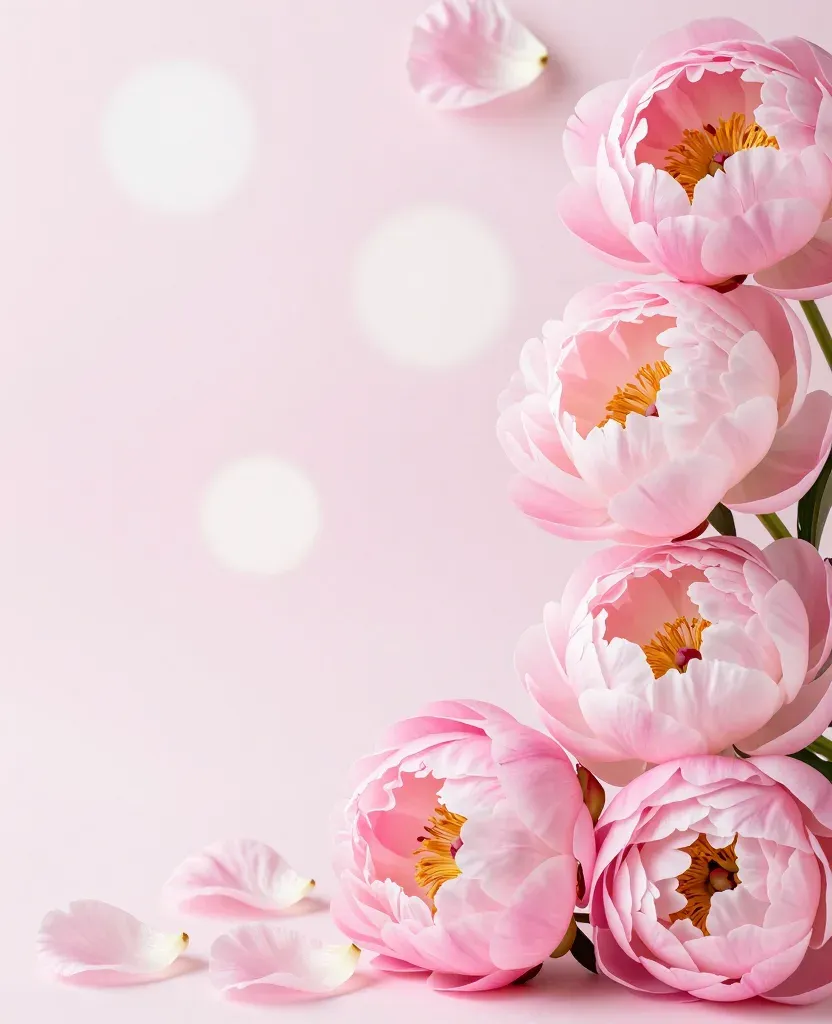 Velvety pink peonies softly bloom in various stages, their petals catching the diffused light from the top left, creating gentle highlights and shadows. The cascading arrangement and soft pastel pink gradient background with subtle bokeh effects add depth and a dreamy quality, making this image ideal for elegant and romantic designs.