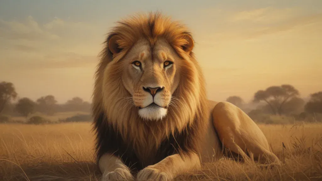 A majestic lion rests in the golden savanna, its thick mane and soft fur highlighted by warm sunlight. The slightly low angle and close-up emphasize the lion's regal presence and the serene, expansive landscape behind it.