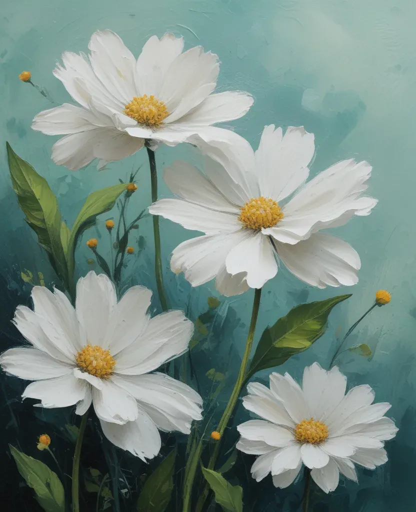 Softly lit white daisies with yellow centers and green leaves are arranged in a balanced composition against a textured teal background, highlighting the glossy and rough impasto technique. The diffused lighting enhances the texture and color of the flowers, providing a calm and neutral backdrop.