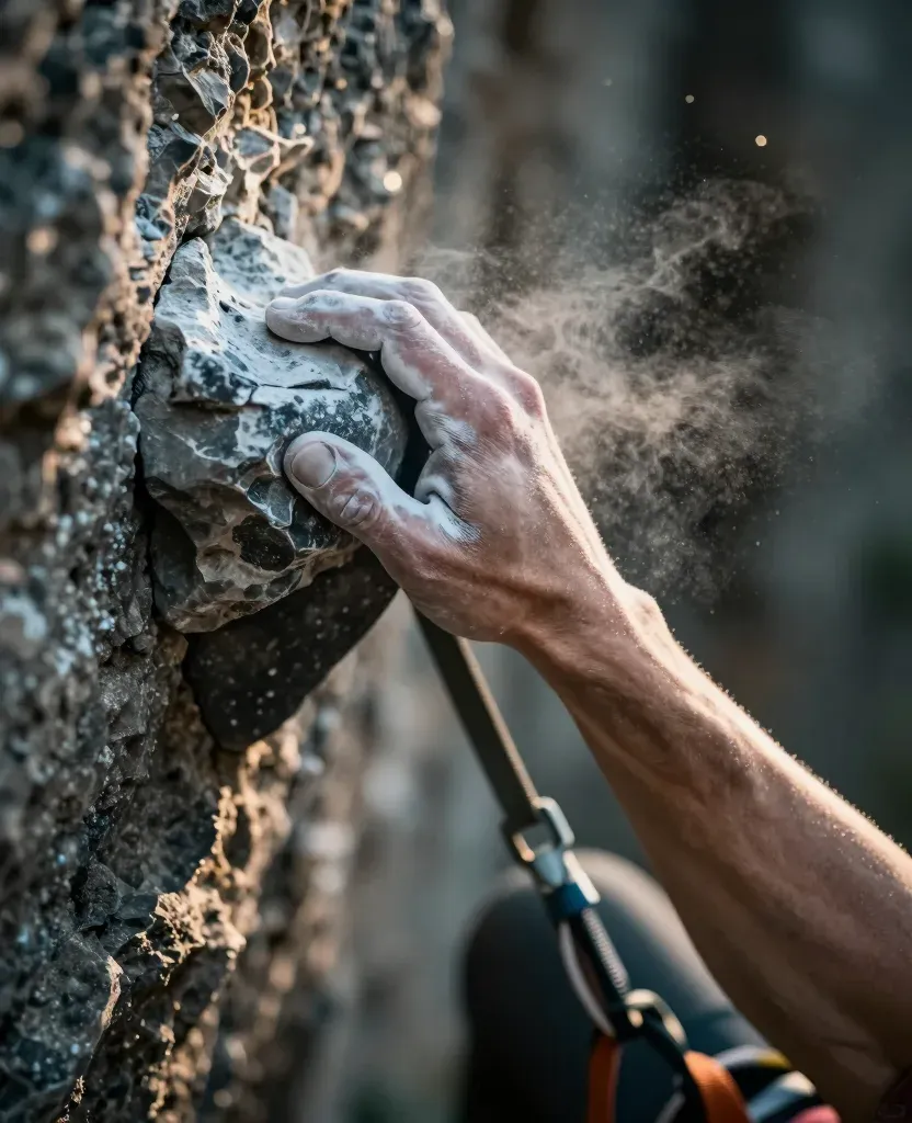 A climber's hand grips a rough, gritty rock face, with chalk dust swirling around, illuminated by warm, directional light casting sharp shadows. The close-up, shallow depth of field emphasizes the hand and rock, with a blurred background.