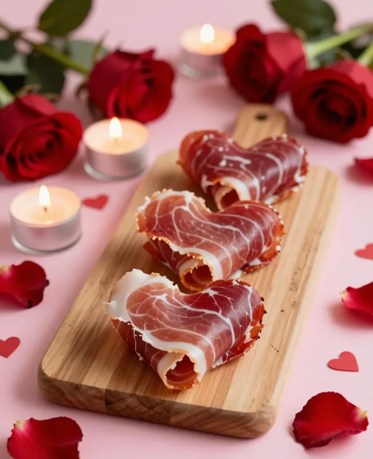 Glossy, marbled prosciutto wraps are artfully arranged on a wooden cutting board, surrounded by soft red roses and tealight candles, creating a warm, romantic ambiance. The soft, diffused light enhances the rich reds and pinks, adding depth and context to the setting.