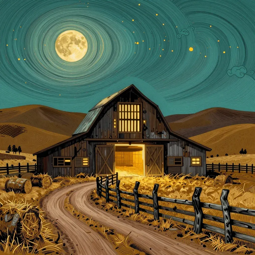 A barn with open doors, emitting warm light, set against a backdrop of a full moon casting a golden glow. The composition leads the viewer's eye through the open doors, creating a sense of depth and inviting exploration of the interior. The rolling hills and scattered trees in the background add to the serene, rural atmosphere.