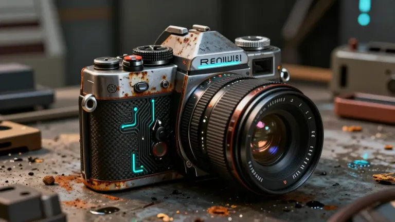 A close-up of a vintage camera with a lens, showcasing its rusty metal and glossy black plastic with blue neon accents, illuminated by warm directional light that highlights textures and casts deep shadows. The shallow depth of field isolates the camera against a blurred industrial background filled with tools and debris, suggesting a workshop setting.