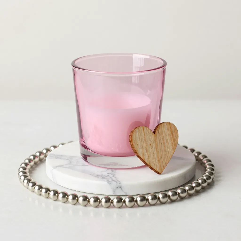 A soft pink candle in a clear glass holder sits on a white marble tray, surrounded by a silver beaded necklace and wooden hearts, bathed in diffused light that highlights the glossy marble and smooth glass textures. The minimalist background and shallow depth of field emphasize the subject, creating a serene and elegant composition.