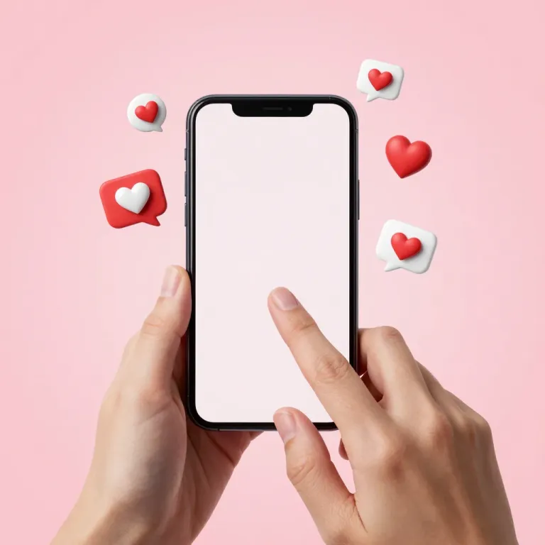 A pair of hands gently holds a smartphone with a white screen, surrounded by floating red and white heart icons against a soft pink gradient background. The diffused lighting highlights the hands and phone, creating a gentle glow and emphasizing the clean, minimalistic composition.