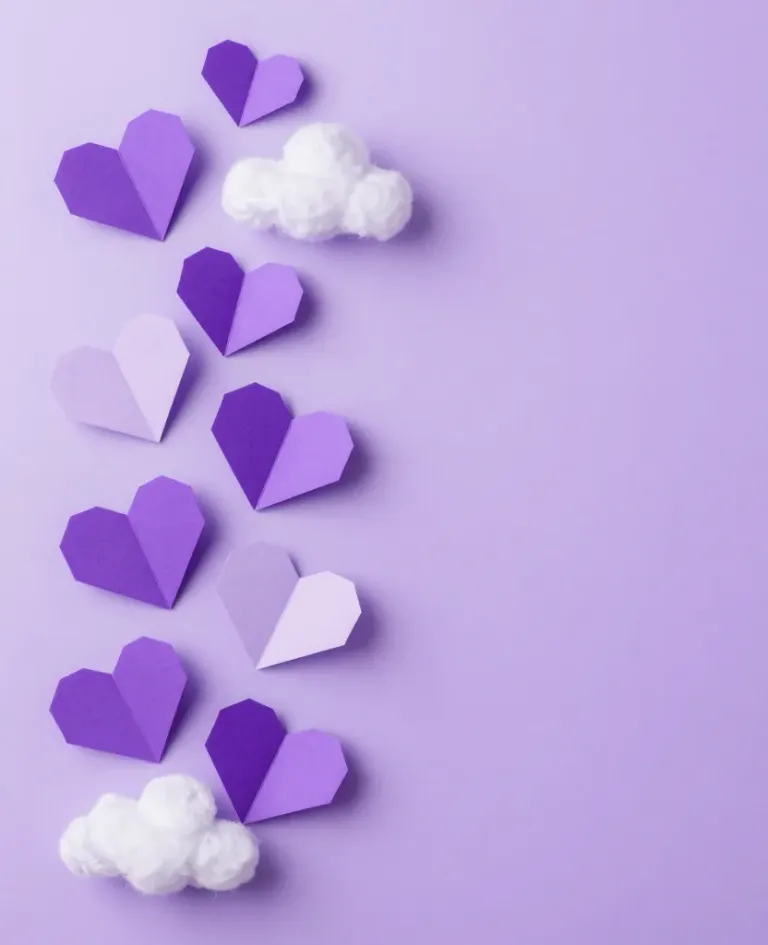 Glossy paper hearts in various shades of lavender and purple float gracefully among fluffy white clouds, illuminated by soft, diffused light that enhances their glossy texture and creates a gentle glow around the clouds. The composition, with its loose, flowing pattern, creates a sense of movement and depth against a slightly blurred, soft lavender background.