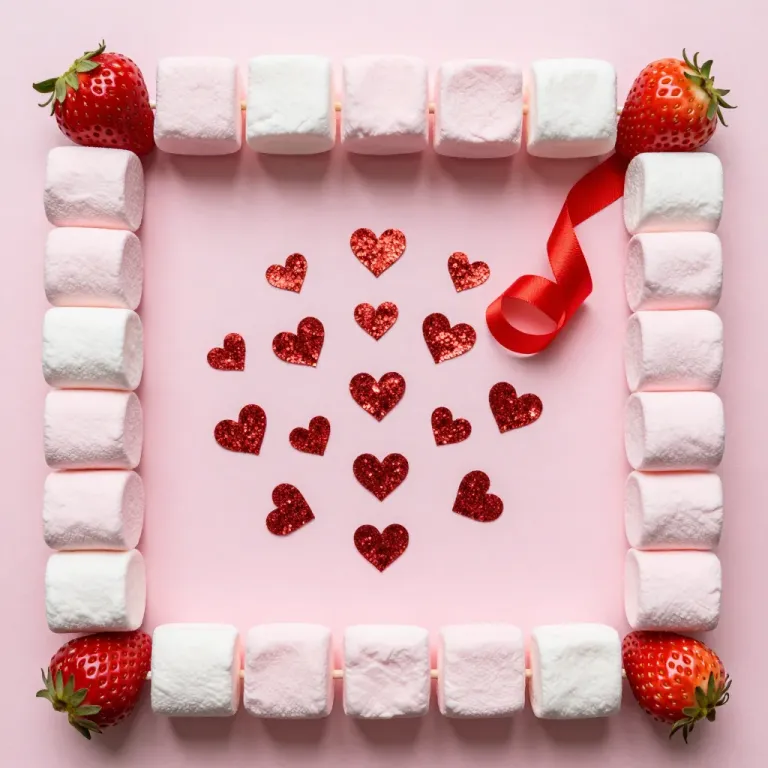 A symmetrical square frame composed of white marshmallows and strawberries encloses a cluster of shiny red heart candies, accented by a satin ribbon, all set against a soft pink backdrop. The soft diffused overhead lighting creates gentle highlights and subtle shadows, while the top-down flat lay perspective and shallow depth of field maintain sharp focus across all elements, providing clean copy space.