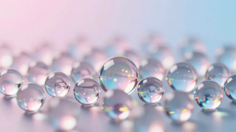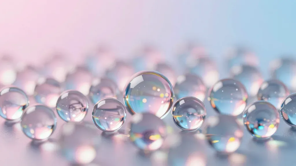 A close-up of glossy, translucent glass beads scattered on a surface, reflecting soft, diffused light and pastel hues, creating a dreamy, shallow depth of field effect. The blurred background enhances the focus on the beads, making them appear as if they are floating in a colorful, ethereal field.