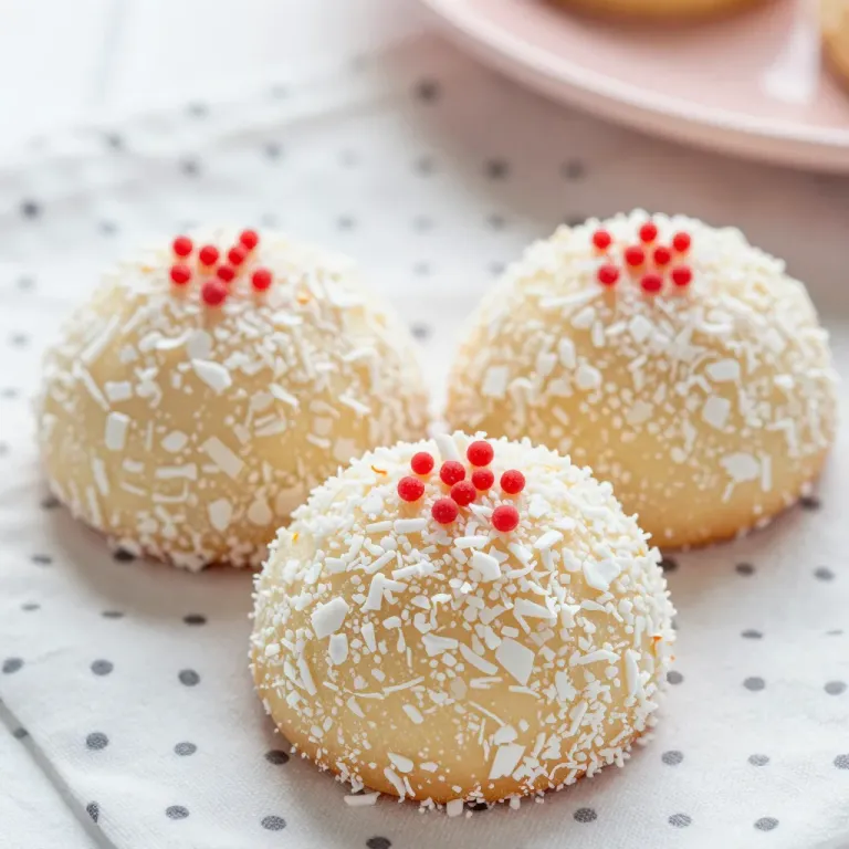 Close-up of coconut snowball cookies with a glossy red sprinkles finish, highlighting their soft texture and crunchy coconut coating. The soft, diffused lighting and shallow depth of field emphasize the cookies, creating a cozy, home-baked atmosphere.