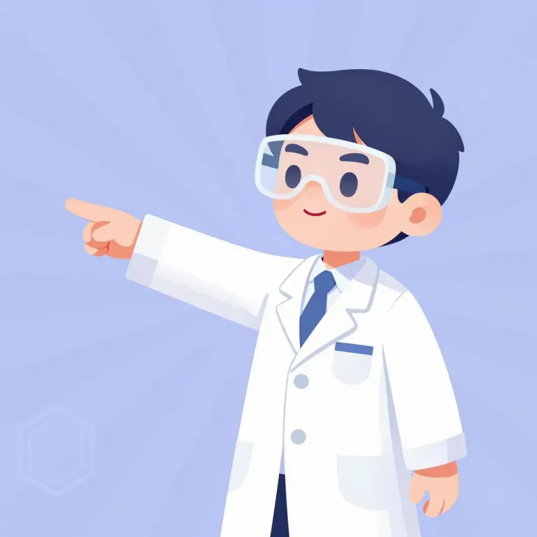 A young scientist in a white lab coat and blue tie points determinedly, wearing safety goggles, against a soft lavender background. The even, diffused lighting highlights the subject's focused expression and the smooth texture of the lab coat.