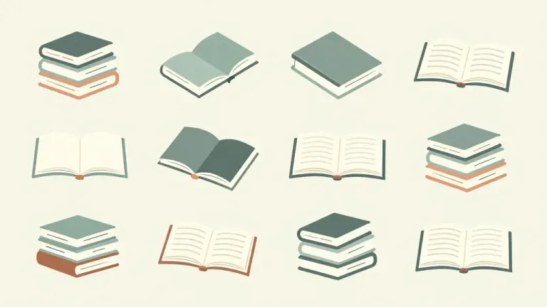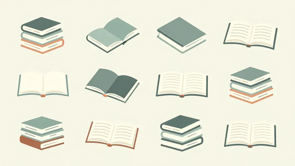 Twelve books in various states—stacked, closed, and open—are arranged in a symmetrical 3x4 grid, featuring matte cloth-like covers and smooth paper interiors under soft, even overhead lighting. The plain off-white background and shallow depth of field ensure all elements are in sharp focus, providing clean, distraction-free composition.