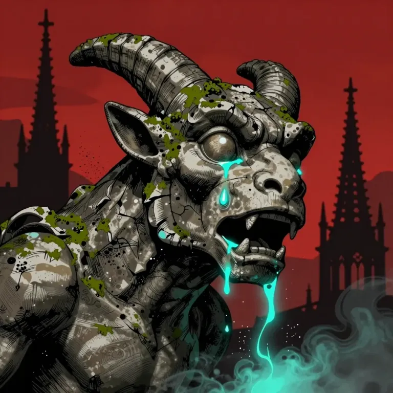 A metallic, decaying gargoyle with glowing blue eyes stands against a dark, gothic spire backdrop, illuminated by directional lighting that highlights its textures and decay. The crimson sky and blurred spires create a dramatic, atmospheric setting.