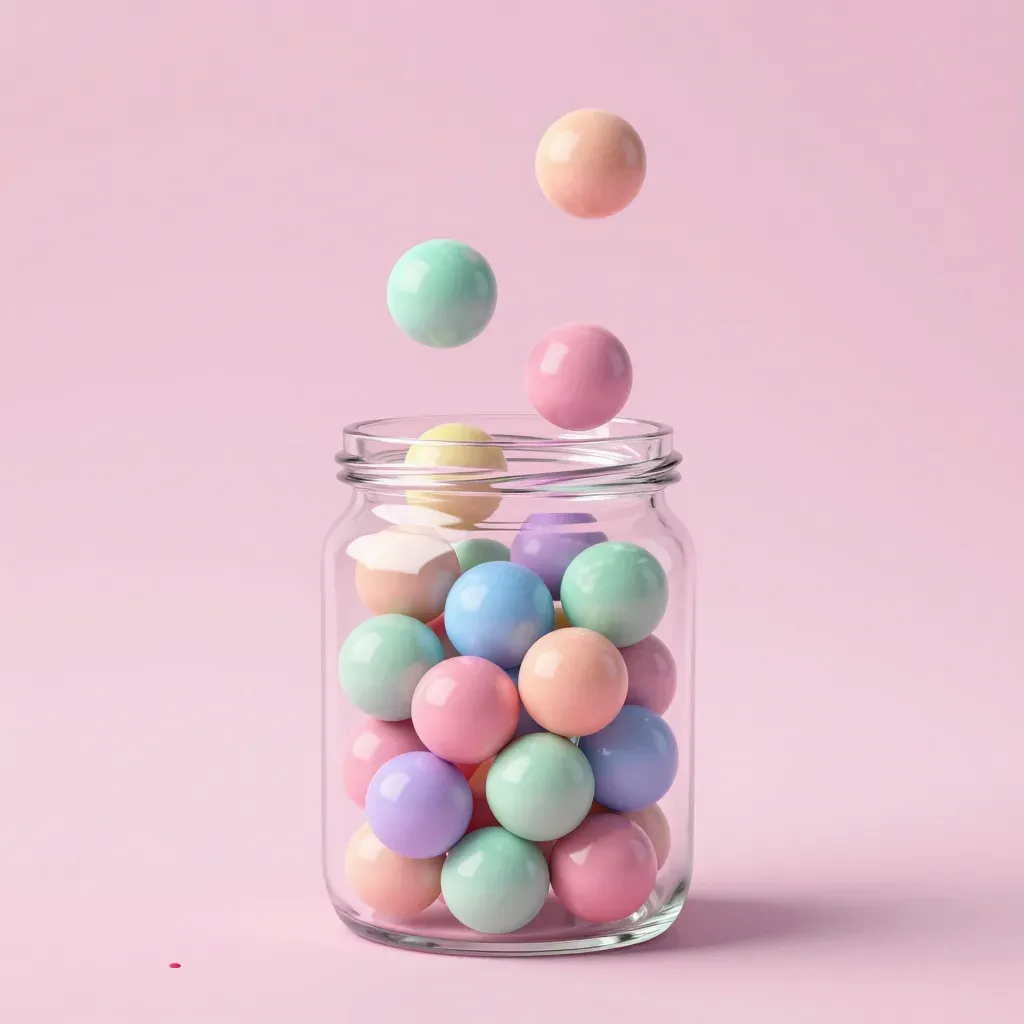 A glass jar filled with glossy, pastel-colored gumballs, illuminated by diffused, warm lighting that creates a dreamy atmosphere. The soft pink background enhances the serene and playful mood of the scene.