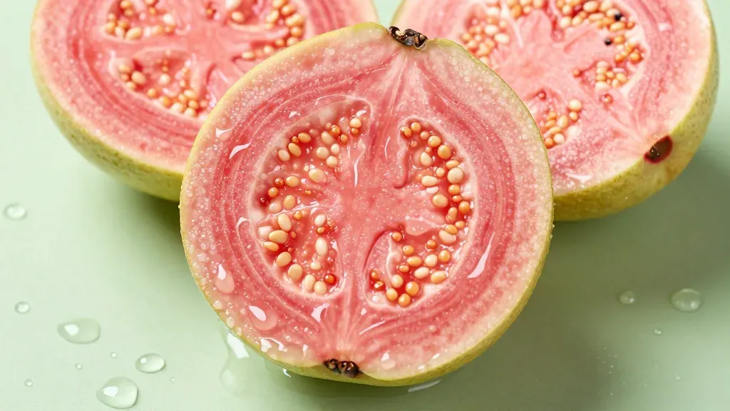 A close-up of sliced guava with vibrant pink flesh and pale green rind, softly lit to highlight its glossy texture and juicy appearance. The muted green background provides a clean contrast, emphasizing the fruit's fresh and inviting nature.