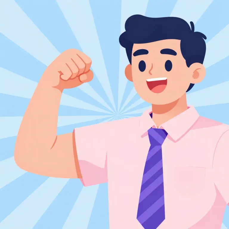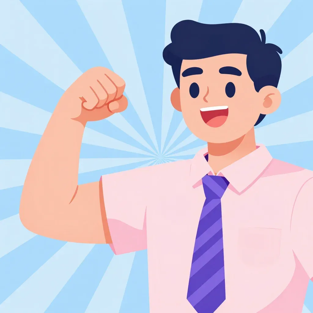 A cheerful businessman flexes his bicep in a glossy shirt and soft tie, set against a radiant sunburst background. The bright, direct lighting and shallow depth of field create a focused and dynamic composition.