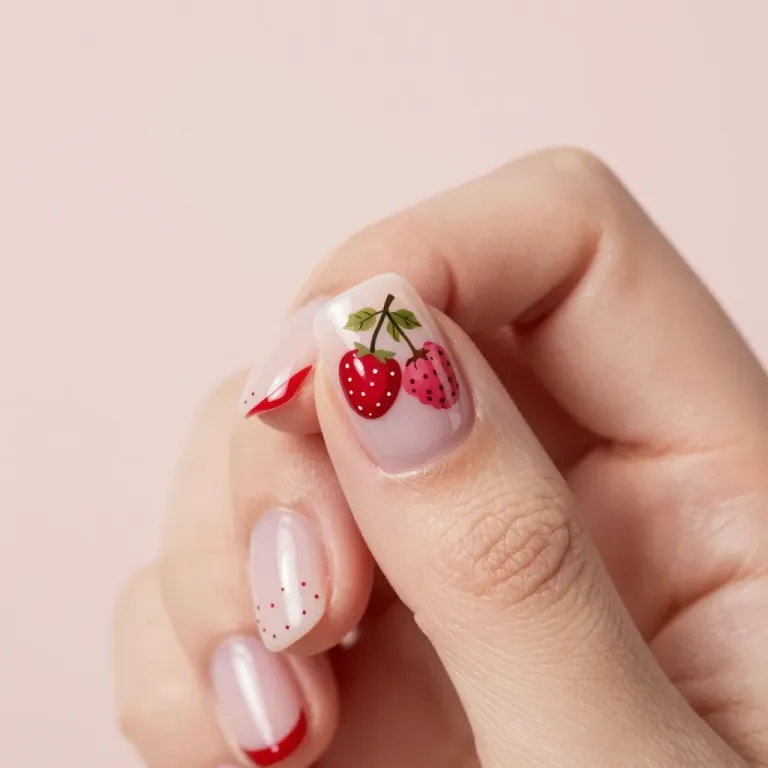 Close-up of a woman’s hand showcasing intricate nail art with strawberry motifs, red accents, and polka dots on a pale pink base, with smooth, high-gloss polish and natural skin texture. Soft, diffused front lighting creates gentle highlights on the nails, while a shallow depth of field isolates the hand against a clean, uniform blush-pink background.