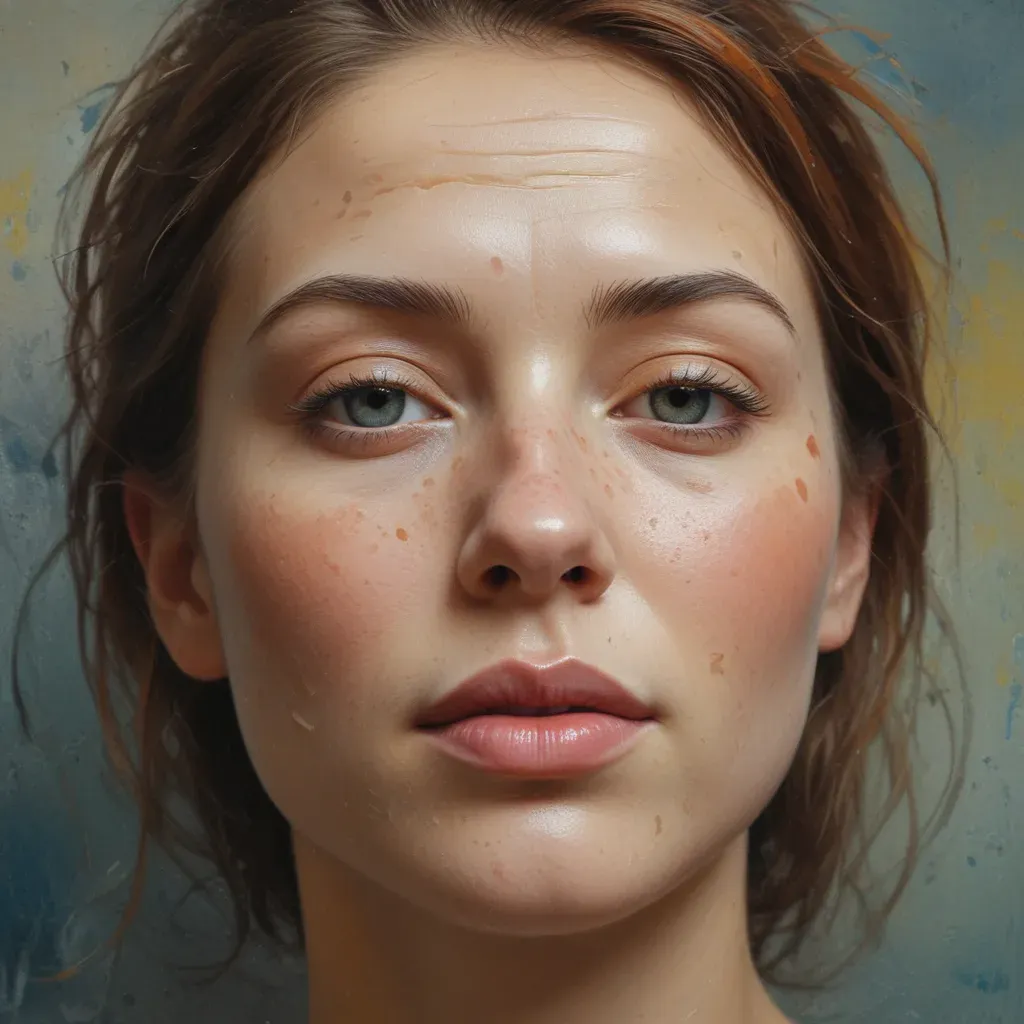 A close-up portrait of a person with wet hair and smooth skin, illuminated by soft, diffused light that highlights the subject's features and creates gentle shadows, giving a natural and serene feel. The shallow depth of field blurs the background slightly, focusing attention on the subject's face against a soft, muted blend of blues and greens.