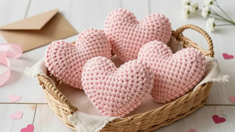 Soft pink crochet hearts nestled in a wicker basket, illuminated by diffused natural light, creating a cozy and romantic atmosphere. The slightly off-center composition and blurred background with scattered red hearts and white flowers add depth and visual interest.