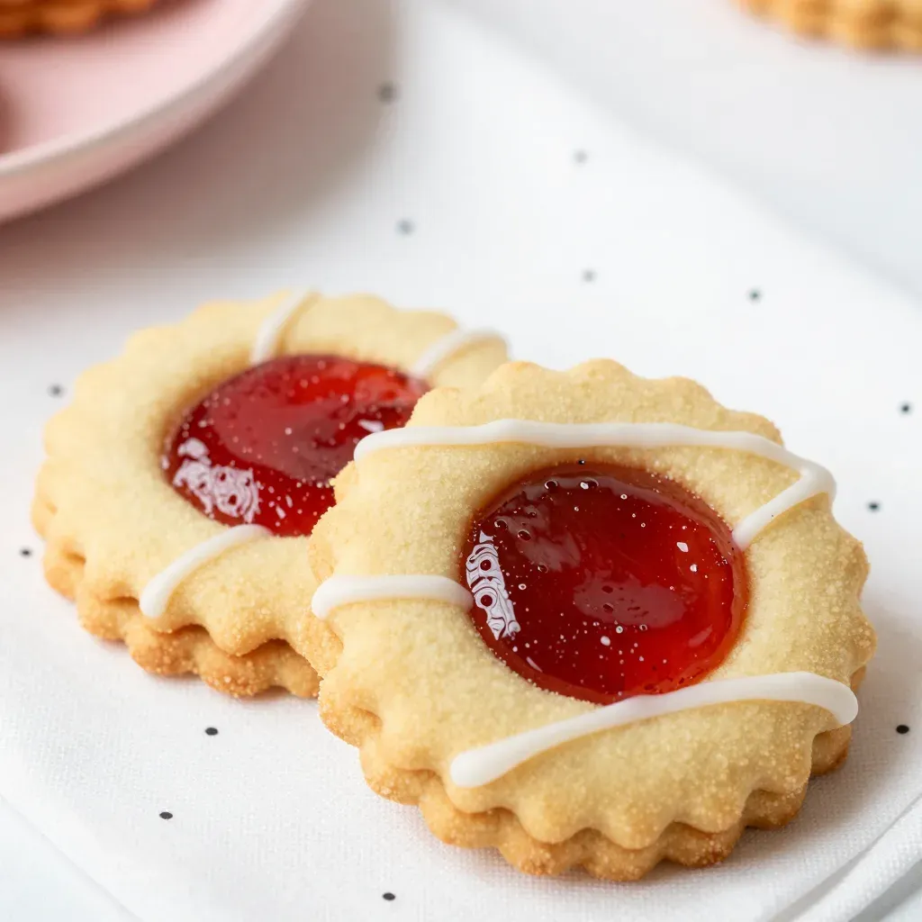 Two golden-brown thumbprint cookies with glossy crimson cherry jam centers and delicate white icing drizzle, showcasing a sandy crumb texture and fluted edges. Soft directional lighting from the upper left creates gentle highlights on the jam and icing, while shallow depth of field isolates the cookies against a blurred kitchen table setting with a polka-dotted plate and soft pink background element.