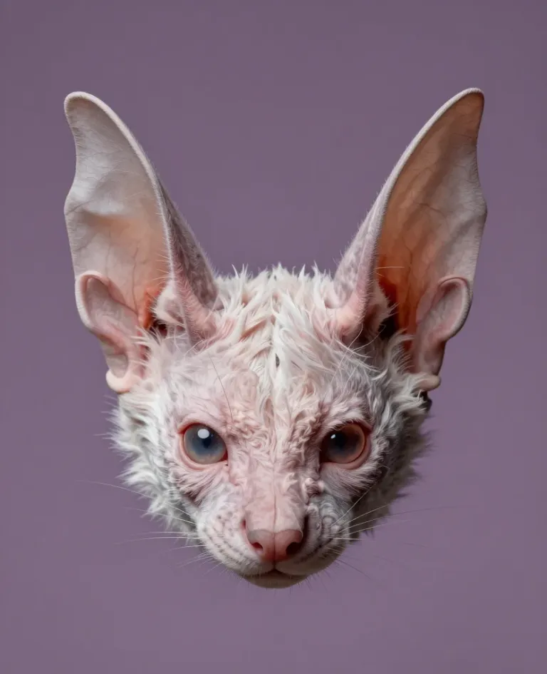 A close-up of an albino bat with large, expressive eyes and delicate, translucent pink skin, softly lit to highlight the texture and details. The neutral, blurred background provides a clean, focused setting for the subject.