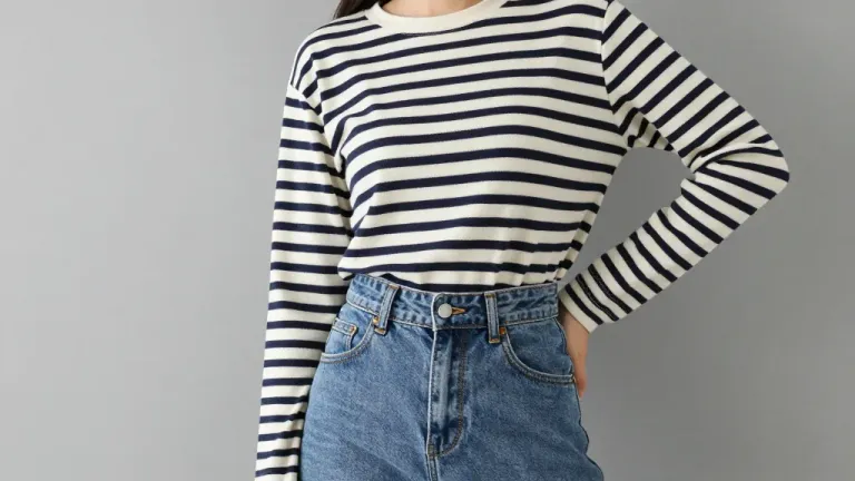 A person models a soft, striped Breton top and slightly worn denim jeans against a neutral gray background. The soft, even lighting highlights the textures and colors of the clothing, creating a clean and focused composition.