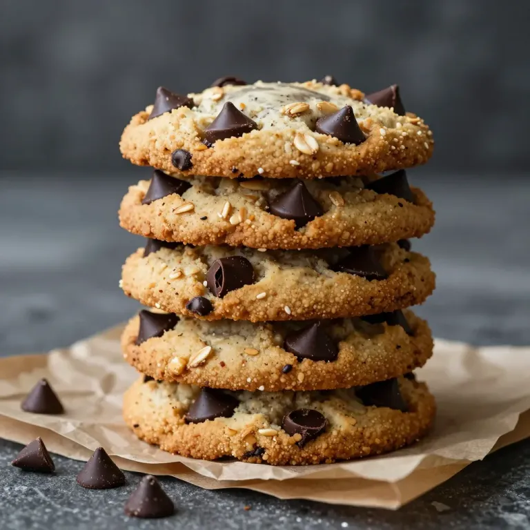 A stack of golden-brown chocolate chip cookies with crispy edges and soft centers, scattered with nuts and seeds, highlighted by soft, diffused lighting that accentuates the glossy chocolate chips and the texture of the cookies. The dark, neutral background with a slight blur keeps the focus on the cookies, providing ample copy space for text or design elements.