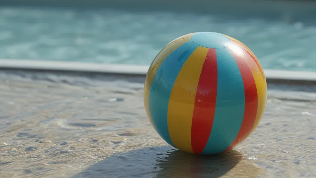 A glossy, rainbow-striped ball reflects direct sunlight, creating vibrant highlights and reflections on its surface. The shallow depth of field and slightly off-center composition emphasize the ball's glossy texture and the cool blue tones of the blurred pool water in the background.