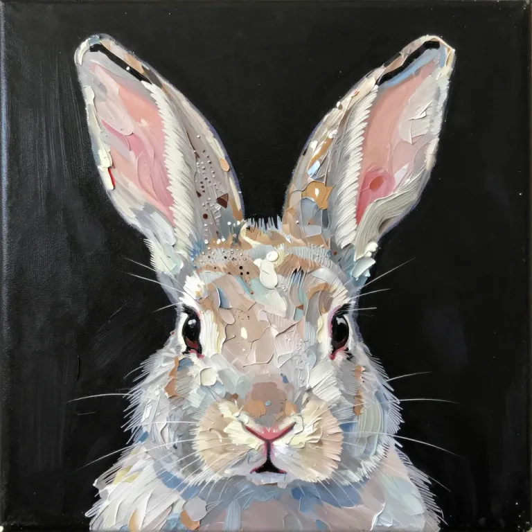 A close-up of a rabbit's face and ears, featuring soft pastel fur with interwoven smooth and rough textures, highlighted by diffused, soft light. The deep black background provides a stark contrast, emphasizing the rabbit's vibrant colors and detailed textures.