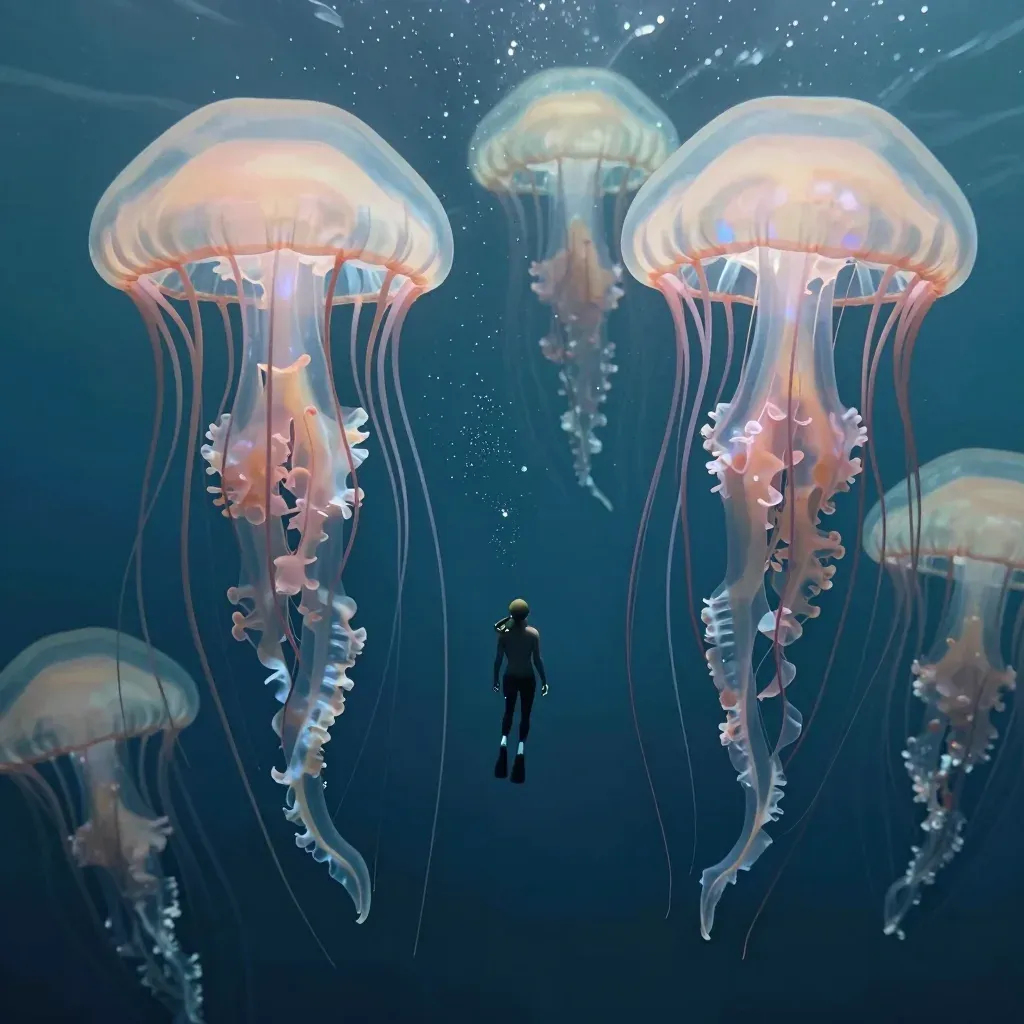 A diver is surrounded by glowing jellyfish in a serene, dreamy underwater setting. Soft, diffused light enhances the ethereal quality of the scene, creating a sense of wonder and tranquility.