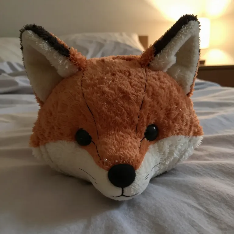 A close-up of a soft, velvety orange plush fox with fluffy white tips on its ears, resting on a white bedspread. The warm, diffused light from a bedside lamp creates a cozy, inviting atmosphere, emphasizing the plush texture and gentle curves of the fox's face.