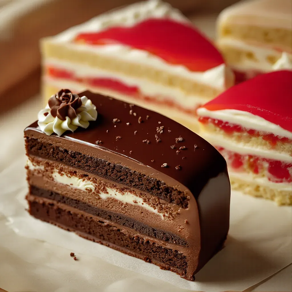 A slice of chocolate cake with glossy chocolate glaze and creamy white frosting, highlighted by warm, diffused light that enhances its three-dimensional appearance. The shallow depth of field keeps the foreground in sharp focus while softly blurring the background, creating a clean and elegant composition.