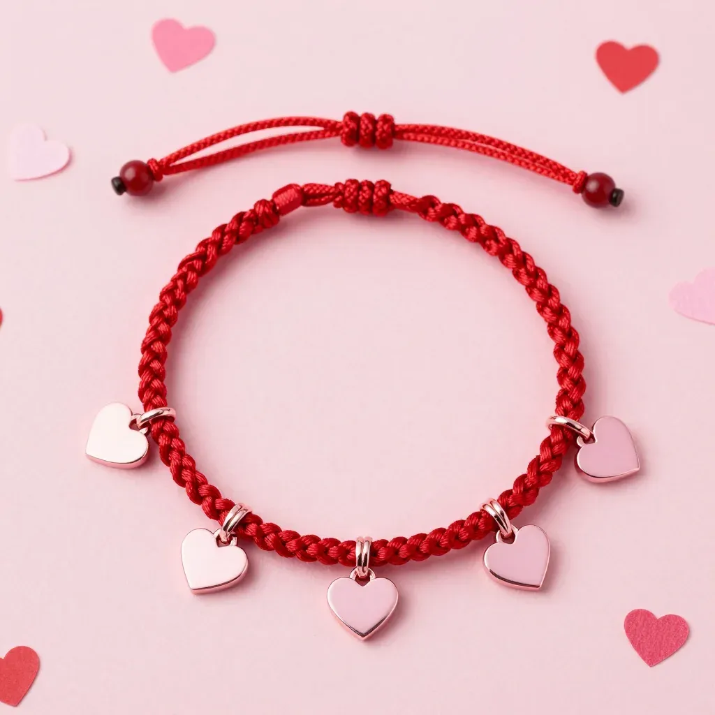 A vibrant red braided cord bracelet adorned with five polished silver-toned heart charms rests on a soft pink surface, with gentle highlights reflecting off the metallic hearts and cord knots. The top-down composition features a shallow depth of field, focusing sharply on the bracelet while softly blurring scattered paper hearts in the background.