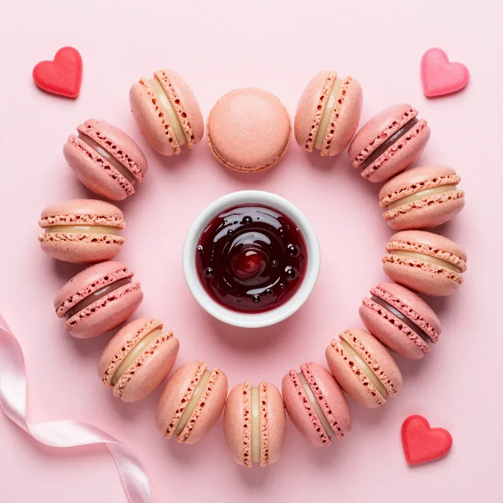 A heart-shaped arrangement of glossy pink macarons frames a bowl of thick, glossy red jam, set against a soft, diffused light that highlights the textures and creates a balanced, symmetrical composition.