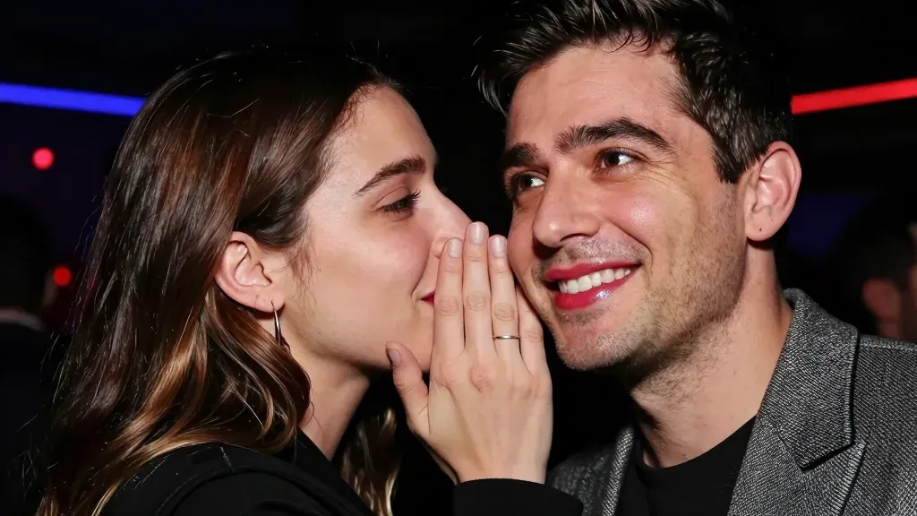 A woman whispers into a man's ear in a vibrant nightclub setting, illuminated by soft neon lights. The intimate close-up emphasizes the couple's interaction against a blurred background of neon reflections, creating a warm and private atmosphere.