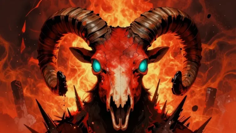 A ram's head with glowing blue eyes and glossy metallic horns is set against a smoky, fiery background, creating a dynamic and intense visual. The high-contrast lighting highlights the texture and depth of the scene, making it ideal for use in high-energy, dramatic compositions.