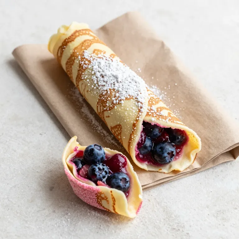 Soft crepe rolls filled with glossy blueberries and dusted with powdered sugar, highlighted by soft natural light that accentuates the texture and vibrant color of the filling. The neutral background ensures the focus remains on the delectable dessert, inviting viewers to indulge in a bite.