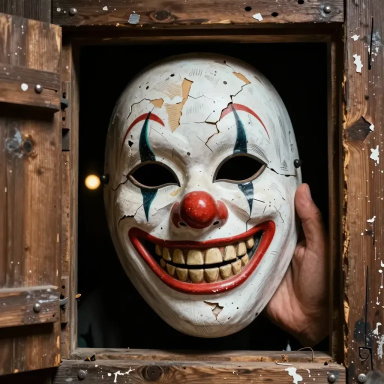 A cracked and peeling clown mask with a glossy red nose and uneven teeth emerges from a splintered wooden trapdoor, partially held by a dry, cracked hand. Directional low-key lighting from the upper left creates deep shadows in the box interior and highlights the mask’s textures, while the tight crop and shallow depth of field emphasize the eerie contrast between light and shadow.