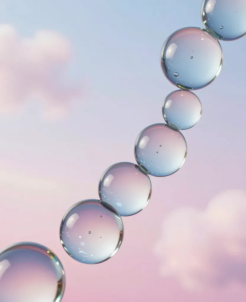 A diagonal line of translucent glass marbles glides across a soft, pastel sky, illuminated by diffused ambient light that highlights their glossy surfaces. The blurred background with bokeh effect enhances the depth and focus on the marbles, creating a serene and elegant composition.