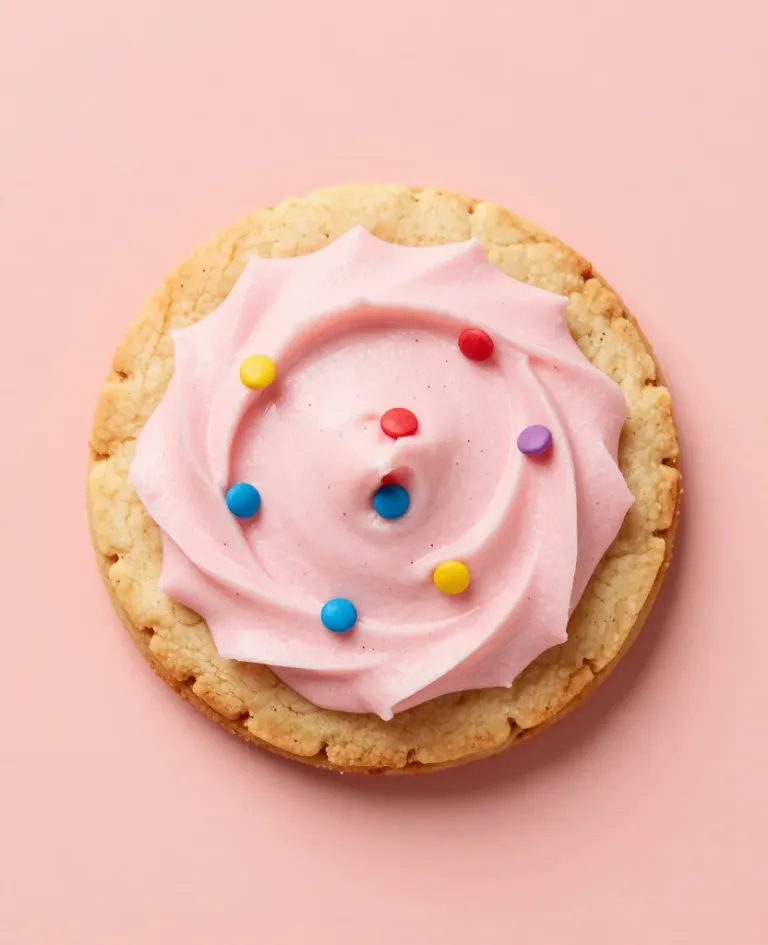 A crisp cookie is frosted with smooth pink icing and topped with glossy, colorful sprinkles, creating a vibrant and appetizing treat. The soft, diffused lighting highlights the glossy frosting and sprinkles, while the clean, solid pink background provides a simple and elegant backdrop.