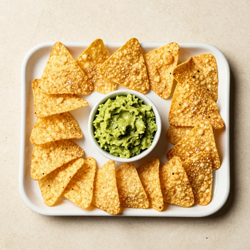 A circular arrangement of crispy, golden tortilla chips surrounding a smooth, creamy guacamole in a white bowl, highlighted by soft, even lighting that enhances the textures and colors of the food. The neutral beige background ensures the vibrant colors of the chips and guacamole stand out.
